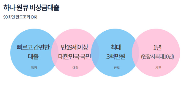 무직자, 대학생, 주부도 가능한 소액대출 상품으로 직업이나 및 소득에 관계없이 하나은행에서 정한 소정의 요건만 충족하면 누구나 신청할 수 있는 비상금 대출 상품입니다. 하나은행 영업점 방문없이 하나 원큐 앱을 통해서 빠르고 쉽게 한도조회 및 대출 신청을 할 수 있다는 것이 특징이죠