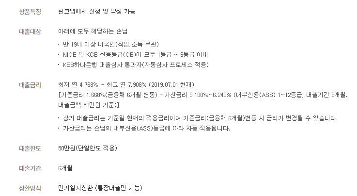하나은행에서는 직업 및 소득에 관계없이 하나은행에서 정한 요건에만 부합하면 대출할 수 있는 신개념 소액대출을 제공하고 있습니다